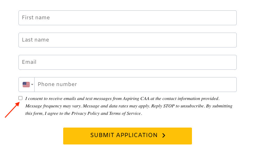 Prior to submitting, users are asked for contact information such as email and phone number. There is a checkbox (originally unchecked) for users to confirm understanding that Aspiring CAA will reach out at the contact information provided.